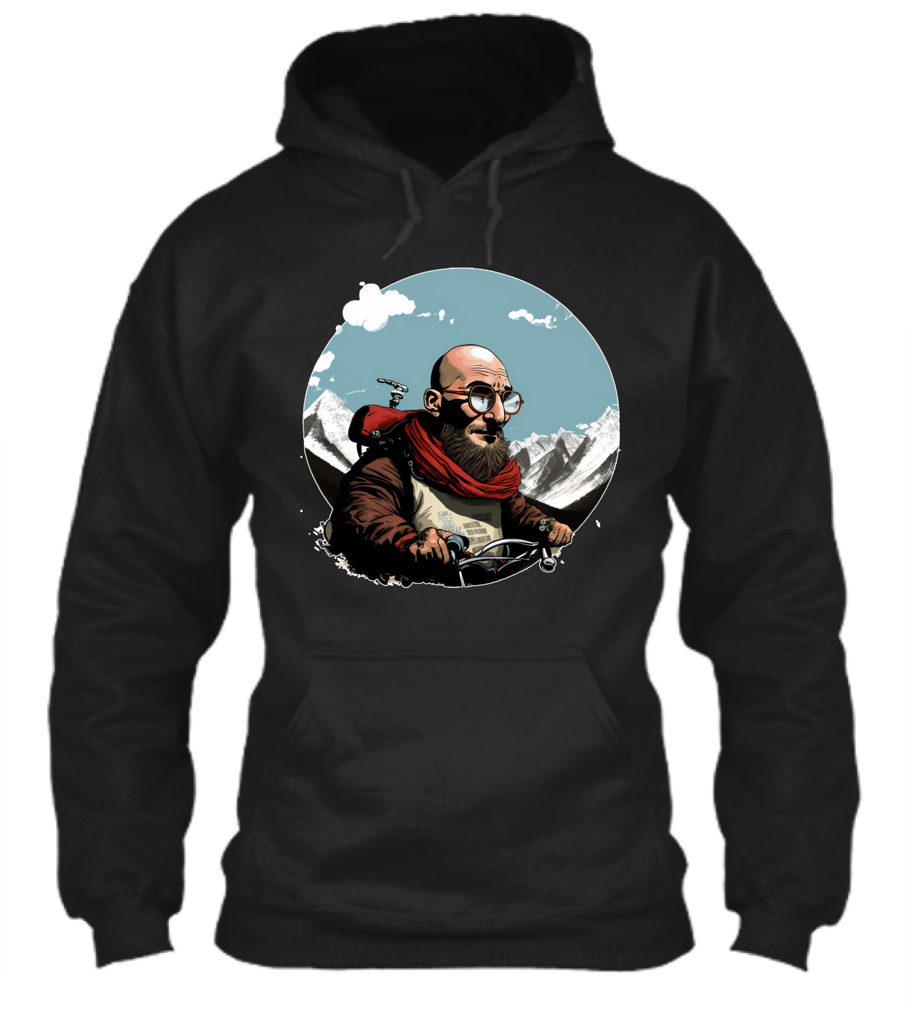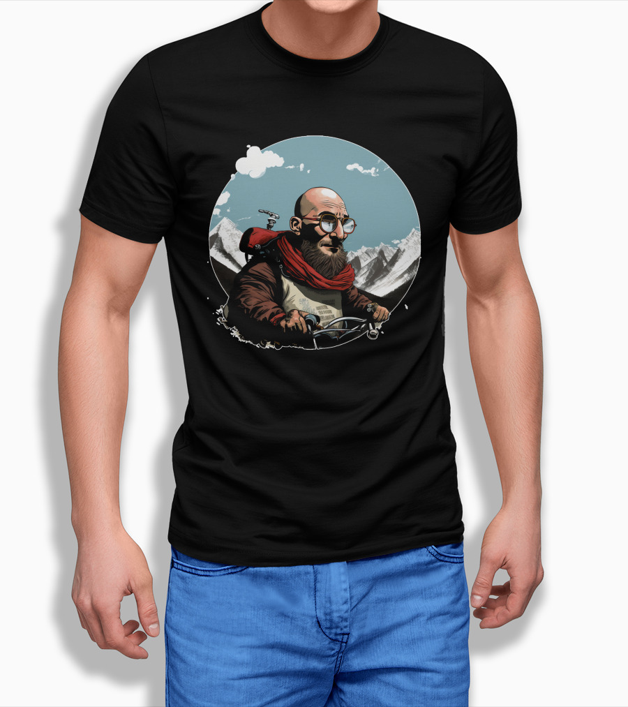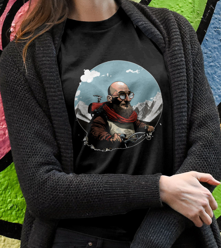 Bald Man On Motorcycle Through Mountain Landscape With Red Scarf And Glasses Shirt