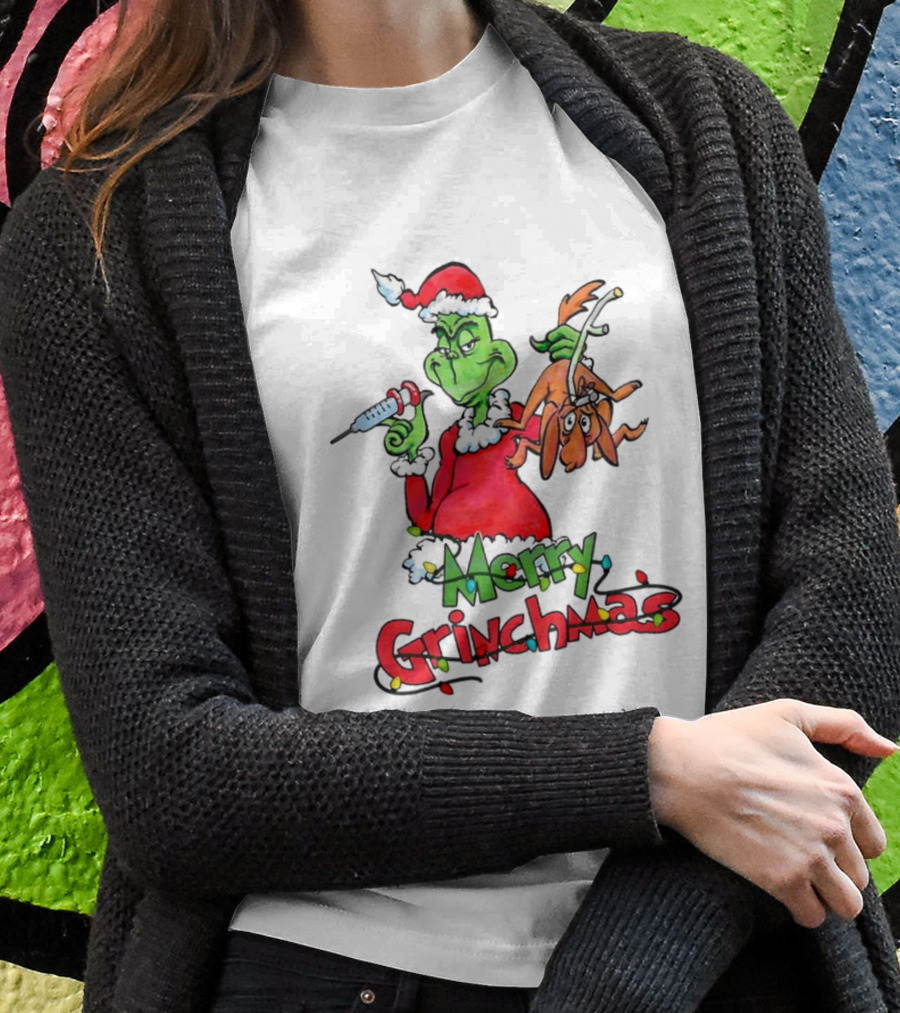 Merry Grinchmas Nurse Christmas Grinch With Syringe And Reindeer Dog Shirt