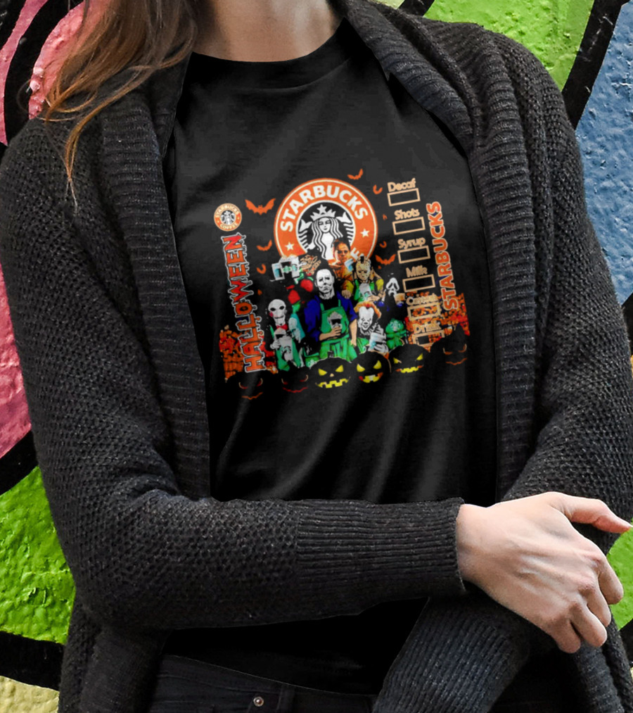 Starbucks Halloween Horror Movie Characters With Pumpkins And Decaf Shots Syrup Milk Custom Drink Shirt